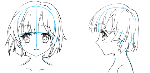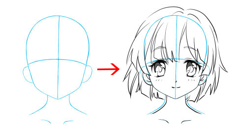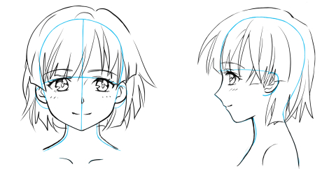 そして、髪型や輪郭、顔の目鼻立ち(おうとつ)、体におちる頭部の影を考えて描きます。文字で描くとなんだか難しく感じますが、絵にすると下のようなカンジです