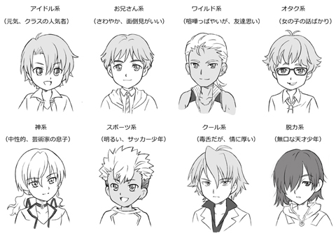 次に、ベースとなる8人の男の子の性格と顔を見ていきましょう。女の子と同様、無数に存在するキャラクターの中から、ありがちなキャラのタイプを選んで、いくつか描いてみました。顔を見てどんな性格が想像してみよう!