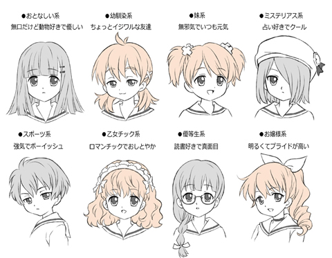 ここでは私がアニメやマンガなどに無数に存在するキャラクターの中から、ありがちなキャラのタイプを選んで、いくつか描いてみました。まずは、ベースとなる8人の女の子の性格と、顔から見ていきましょう。