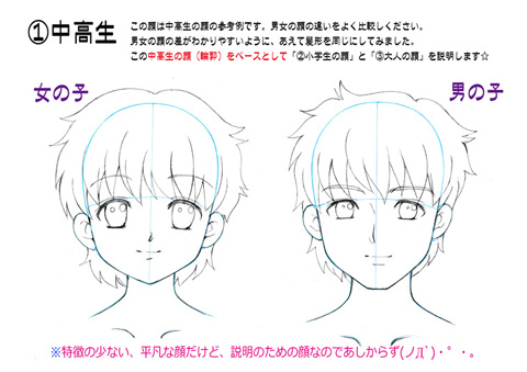 男女の平凡な顔の基本の型をつくってみました。高校生くらいになれば男女差は大きくなるよネ!女キャラと男キャラの違いはどこにあるのか覚えよう(≧ω≦)