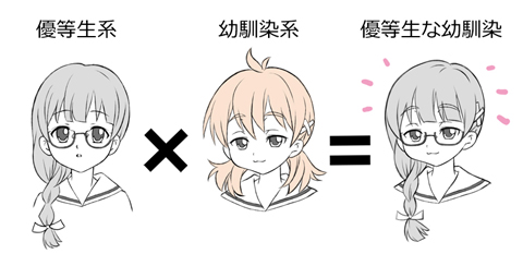 キャラクターには、いろんな系がありますが、組み合わせでまた、新しいキャラをつくることもできます。ためしに優等生系のキャラと、幼馴染系のキャラをミックスしたら、こんなキャラができちゃいました〜( o^∇^)