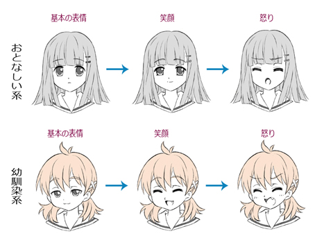これはひとつの例です。とりあえず基本の表情を作ってから、キャラの性格をイメージしてみると、生き生きとした表情が描けるようになると思います