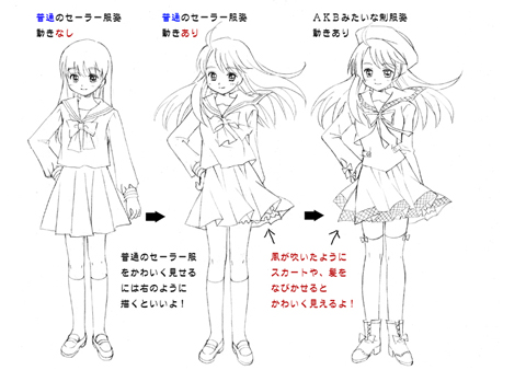 そのまえにまずは、かわいく服を描くためのコツを覚えましょう☆普通のセーラー服であっても、ちょっとした一工夫でかわいく見せられます。