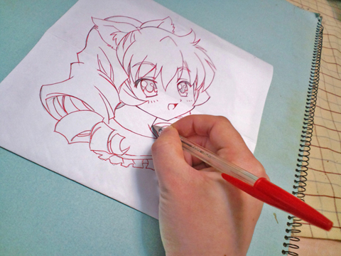 赤いボールペンで下描きの線をやや強めになぞります。(黒いボールペンだと、どこをなぞっているのか分かりずらいため、色つきペンでね)
