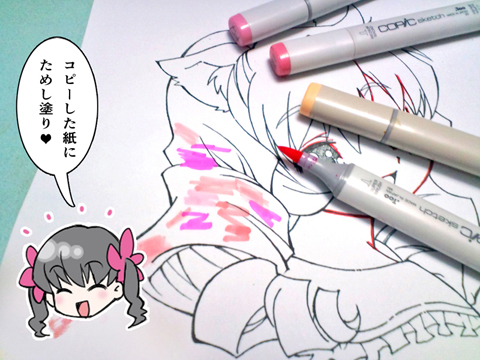 いきなり塗らず、そのコピーの紙にためし塗りして、何色で塗るかここで決めていきます。