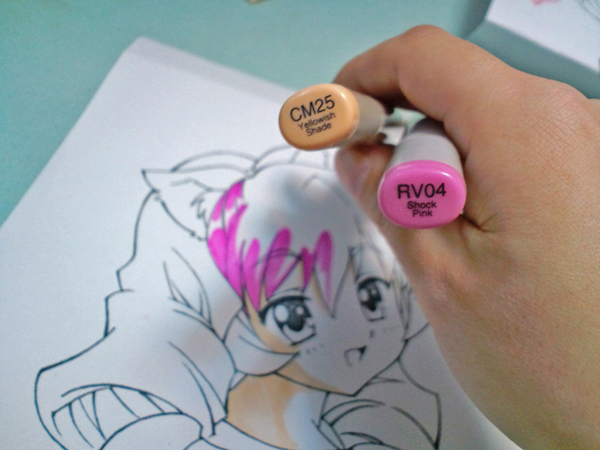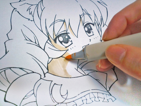 通常のぼかし塗りは色を塗る前にクリアブレンダー(透明色)を先に塗る場合が多いかと思いますが、色紙の場合はマーカーの渇きが早いので、先にパールオレンジ(薄いピンク色)を塗ってからクリアブレンダーでぼかす方がオススメです。顔はお化粧するような感じで塗っていくといいでしょう。