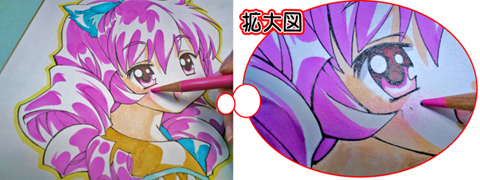 まつ毛は黒く塗りつぶし、瞳はカケアミのような斜線を使って仕上げます。